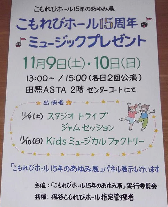 2013秋のイベント出演情報(10/8更新) (2013-10-08)(2013-10-09)kidsmf Kidsミュージカルファクトリーの、秋のイベント出演情報です♪ ●10月27日(日)15:40~16:00(予定) 「東久留米市民プラザ音楽祭」 @東久留米市役所 市民プラザ ●11月10日(日)13:00〜、15:00〜 「こもれびホール15th あゆみ展コンサート」 @田無アスタセンターコート (西武新宿線田無駅前) ぜひ見に来て下さいね♪